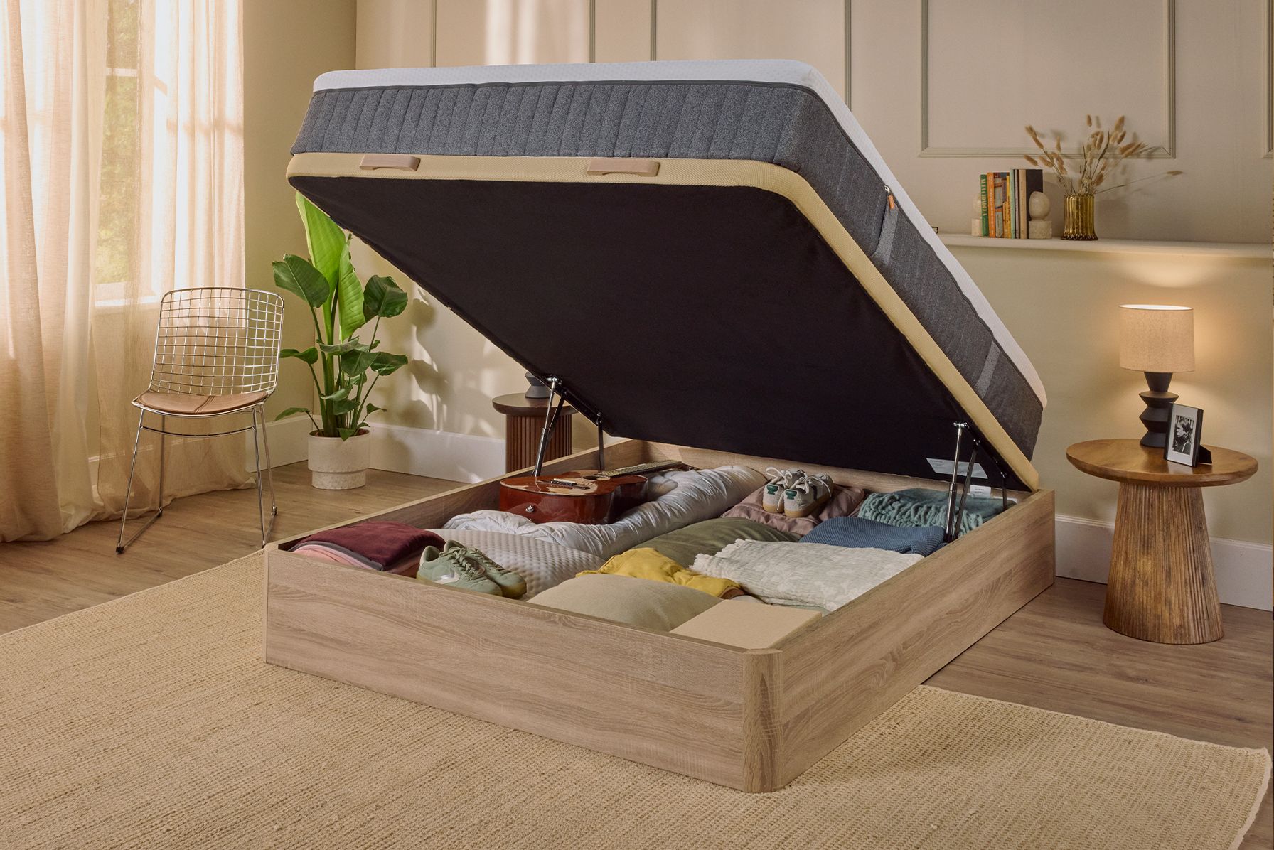 Su sistema hidráulico SmartLift permite una apertura suave y sin esfuerzo: basta con tirar ligeramente del asa de haya lacada y la tapa se elevará casi por sí sola, de forma silenciosa. Incluye un arquillo de sujeción para mantener el colchón siempre en su sitio.